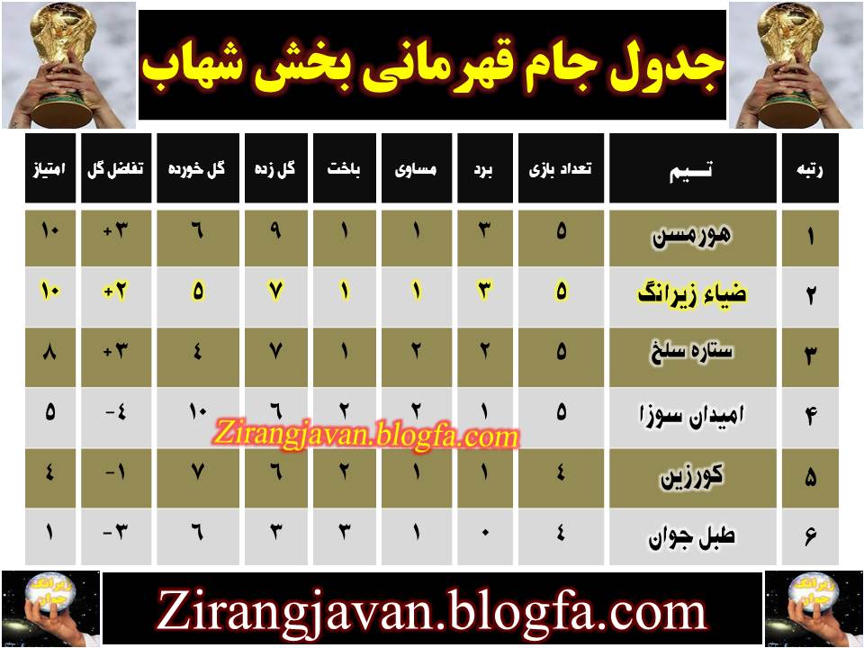 نتایج آخرین بازیها: هورمسن2 طبل جوان 1 ضیاء زیرانگ 0 ستاره سلخ 2 امیدان سوزا 2 کــــــورزیـــن4 امیدان سوزا 1 طبل جوان 0 ضیاء زیرانگ 1 امیدان سوزا 1 هــور مسن 2 کـــورزین 1 طبل جوان1 ستاره سلخ1 ستاره سلخ 3 امیدان سوزا 0 ضیاء زیرانگ 1 هور مسن 0 نتایج کامل بازیها در ادامه مطلب